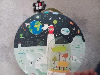 Rompecabezas circular con temática espacial, ideal para los pequeños exploradores. - Diseño de planetas, cohetes y astronautas. - Caja con asa para fácil transporte.