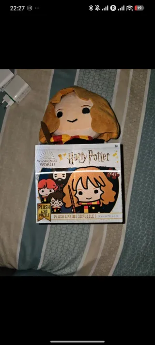 Kit de Harry Potter con varios artículos. - Bufanda con los colores de Gryffindor. - Varita de Harry Potter. - Peluche de Hermione. - Puzzle 3D de Hermione