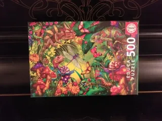 Puzzle de 500 piezas con una vibrante ilustración de fantasía. Dificultad elevada pero aun asi entretenido. Hecho dos veces y completo - Diseño con camaleones, mariposas, ranas y setas. - Colores vivos y detallados. - Marca: Educa Puzzle.