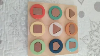 Juego de encaje de formas de madera de la marca Vertbaudet. - Incluye 9 piezas de diferentes formas y colores. - Fomenta la coordinación y el reconocimiento de figuras. - Recomendado para mayores de 12 meses.