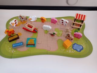 Divertido puzzle de madera con temática de granja. - Incluye piezas de animales como vaca, burro, cerdo, gallo, patos y gallina. - También contiene piezas de un granjero, un tractor y una casa de campo. - Las piezas tienen un pomo para facilitar su agarre.