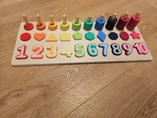 Juego educativo de madera con números y formas. - Incluye piezas de colores. - Diseñado para el aprendizaje. - Material de madera resistente.