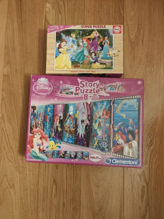Pack de dos puzzles de Disney Princesas, ideal para los más pequeños. - Puzzle 1: Super Puzzle de Educa con 100 piezas. - Puzzle 2: Story Puzzle in 8 Frames de Clementoni con 100 piezas.