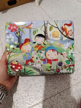 Divertido puzzle de la marca Goula con 54 piezas. - Ilustración colorida con niños y animales. - Ideal para desarrollar la motricidad fina y la observación. - Incluye caja de lata con algunos golpes. - Tamaño de puzzle 50x37.5 cm. - Está completo y muy nuevo. Único defecto en la caja.