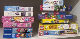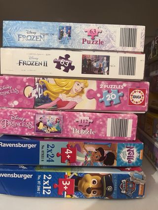Se vende lote de 13 cajas de puzzles variados para niños y niñas entre 3 y 6 años. Hay puzzles de diferentes tamaños y piezas. - Puzzles de Disney: Frozen, Frozen II, Princesas , Nella, Spiderman, Marvel Avengers, Pokemon, Patrulla Canina, Peppa Pig, Minions, Super Zings, Simón ... - Puzzles de Ravensburger, Clementoni, Educa.