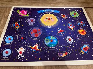 Divertido puzzle de madera con temática del sistema solar y los planetas. - Incluye piezas de planetas, el sol, la luna, cohetes y astronauta. - Diseñado para el aprendizaje.