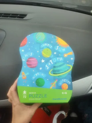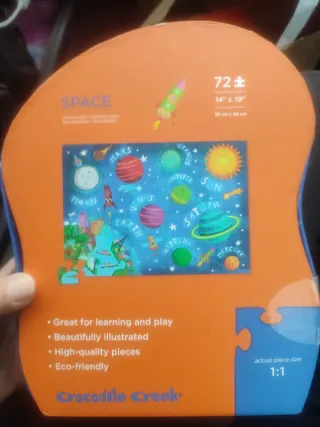 Puzzle de los planetas del sistema solar, con un diseño espacial muy colorido. Ideal para los pequeños exploradores. - 72 piezas. - Marca: Crocodile Creek. - Edad recomendada: 6+ años.