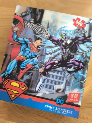 Puzzle Prime 3D de Superman con 500 piezas. La imagen muestra a Superman luchando contra un villano. - Incluye 500 piezas. - Diseño 3D. - Dimensiones: 24 x 18 pulgadas (61 x 46 cm).