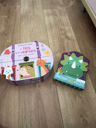 Set de puzle y libro El Tren de los Animales de Sassi, recomendado para mayores de 3 años. Incluye un puzle gigante y un libro. 10€ - Puzle de 20 piezas. - Diseño de tren con animales. - Caja con forma de maleta. Puzle dinosaurio +3 años con 12 piezas. 5€ Completamente nuevos. Precio 12€ los dos