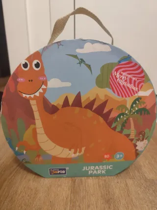 Puzzle temático de Jurassic Park con un diseño divertido de dinosaurios y un paisaje prehistórico. Incluye una etiqueta de Merry Christmas. - 80 piezas. - Apto para mayores de 3 años. - Diseño circular con asa para transportar.