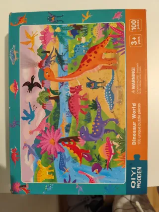 Puzzle infantil de Qiyi Wooden con temática de dinosaurios. Ideal para los más pequeños. Sin abrir - 100 piezas únicas. - Diseño colorido de Dinosaur World. - Advertencia: Contiene piezas pequeñas, no apto para menores de 3 años.