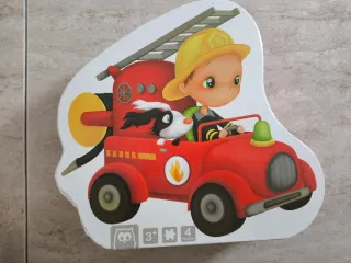 Divertido puzzle con diseño de bombero y su perro en un camión. - Ilustración infantil. - Apto para mayores de 3 años. - 4 puzzles: de 6, 8, 12 y 16 piezas