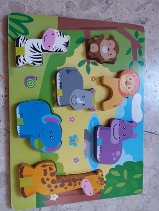 Divertido puzzle de madera con temática de animales de la selva. Ideal para los más pequeños. - Piezas de madera con formas de animales. - Diseño colorido y atractivo. - Incluye cebra, mono, hipopótamo, león, elefante y jirafa. - En las fotos se ve como tiene algunos rasguños de Rotulador