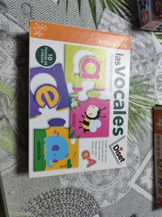 Set de 10 puzzles de 3 piezas de la marca Diset para aprender las vocales. Cada puzzle está diseñado para ayudar a los niños a familiarizarse con las letras. - Incluye vocales en mayúsculas y minúsculas. - Ilustraciones infantiles como 'abeja' y 'elefante'.