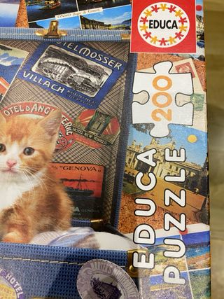 Puzzle de 200 piezas de la marca Educa con una adorable imagen de gatitos dentro de una maleta llena de pegatinas de viajes. - Diseño: Gatitos y temática de viajes. - Número de piezas: 200.