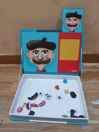 Divertido juego de Janod para crear caras magnéticas. - Incluye 12 tarjetas de base. - Contiene 67 imanes para combinar. - Fomenta la creatividad y la imaginación. Falta una nariz y alguna pieza esta deteriorada como aparece en la foto