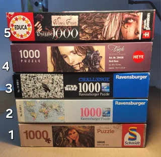 Lote de 5 puzzles de 1000 piezas de diferentes marcas. - Puzzle 1: Josephine Wall, Schmidt Spiele, 58846, 693 x 493 mm. 13. - Puzzle 2: Ravensburger Puzzle, mapa del mundo, 1000 piezas. 10 euros falta una marcada - Puzzle 3: Ravensburger Puzzle, Star Wars, Challenge, 1000 piezas. 10 euros. - Puzzle 4: Heye, Victoria Francés, Dark Rose, 1000 piezas, 50 x 70 cm. 10 euros - Puzzle 5: Educa Puzzle, Victoria Frances, 1000 piezas. 13 euros