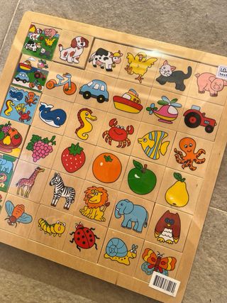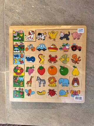 Puzzle de madera con ilustraciones de animales y vehículos. - Piezas de madera resistentes. - Diseños coloridos y educativos. - Ideal para el aprendizaje temprano.