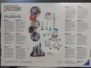 Puzzle 3D de Ravensburger con temática de Frozen II, que recrea un impresionante castillo. Ideal para fans de la película. - 216 piezas. - Incluye 93 accesorios. - Tecnología Easyclick para un montaje estable. - Dimensiones: 46 x 27 x 54 cm.