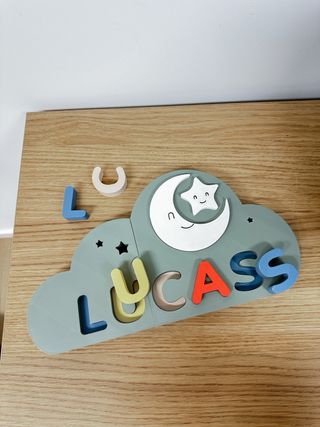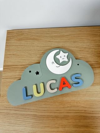 Puzzle infantil personalizado con el nombre que elijas, impreso en 3D con PLA, un material seguro y ecológico. Su diseño en forma de nube con luna y estrella sonrientes lo convierte en un regalo único y decorativo. Ideal para: • Actividades de aprendizaje con letras. • Regalos de nacimiento • Cumpleaños • Decoración de habitación infantil •