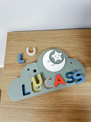 Puzzle infantil personalizado con el nombre que elijas, impreso en 3D con PLA, un material seguro y ecológico. Su diseño en forma de nube con luna y estrella sonrientes lo convierte en un regalo único y decorativo. Ideal para • Regalos de nacimiento • Cumpleaños • Decoración de habitación infantil • Actividades de aprendizaje con letras