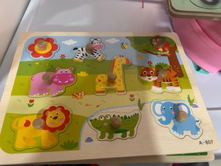 Usado muy pocas veces, está como nuevo. Puzzle de 4 piezas de madera ilustrado con 4 animalitos domésticos: perro, gato, pájaro y pez. Los niños pueden encajar las distintas figuras guiándose por su silueta o por el dibujo interior, este coincide con el el objeto para hacer más sencillo el emparejamiento. Cada una de las piezas tiene pivotes grandes para facilitar el agarre. Habilidades que desarrolla: la habilidad manual, la atención ojo/mano y aprender a asociar la piezas por la silueta o dibujo.