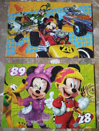 Lote de 2 puzzles de madera de Mickey and the Roadster Racers de EDUCA. Cada puzzle tiene 50 piezas grandes y resistentes, ideales para peques. Incluye caja original y ambos puzzles están completos, como se ve en las fotos montados. Las piezas están marcadas por detrás con pequeñas “X” para distinguir un puzzle del otro y facilitar el montaje, pero por la parte del dibujo se ven perfectas. Edad recomendada: desde 4 años aprox. Perfecto para amantes de Mickey, Minnie y Pluto y para trabajar atención, lógica y motricidad fina.