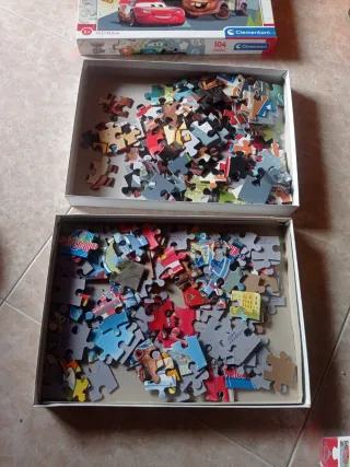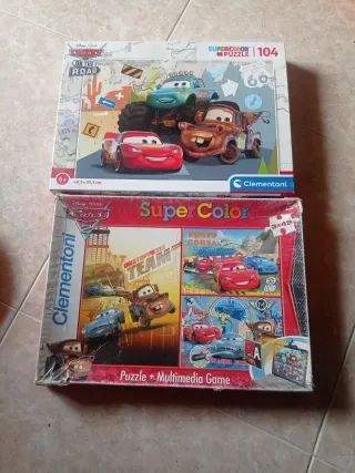 Dos puzzles de la marca Clementoni de la película Cars. - Puzzle On The Road con 104 piezas. - Puzzle Super Color con 3x48 piezas.