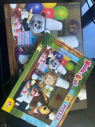 Puzzle de 24 piezas con los personajes de Masha y el Oso. Ideal para los más pequeños. - Ilustración colorida de Masha, el Oso y Panda. - Piezzas grandes ideal para niños pequeños