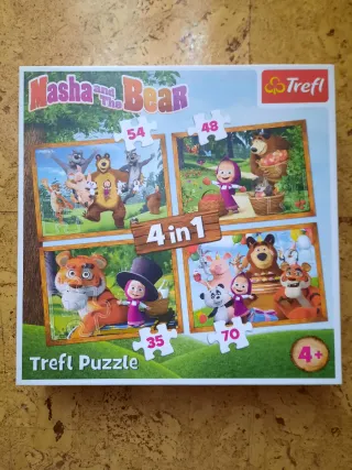 Set de 4 puzzles de la popular serie Masha y el Oso de Trefl. COMPLETO - Incluye 4 puzzles con diferentes piezas: 70, 54,48 y 35 piezas