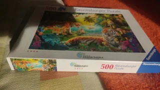 Puzzle de la marca Ravensburger con 500 piezas que representa una escena de tigres en la jungla. Ideal para aficionados a los puzzles y amantes de los animales. Sin abrir - 500 piezas. - Diseño de tigres en un entorno selvático. - Año 2024.