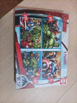 Pack de 4 puzzles de los Vengadores, ideal para fans de Marvel. Cada puzzle tiene un número de piezas diferente. - Puzzle 1: 100 piezas - Puzzle 2: 50 piezas - Puzzle 3: 120 piezas - Puzzle 4: 70 piezas