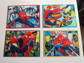 Pack de 4 puzzles de Ravensburger con temática de Spiderman. - Incluye 4 puzzles con diferentes imágenes de Spiderman. - Diseñados para niños a partir de 3 años. - Cada puzzle tiene un número de piezas diferente: 12, 16, 20 y 24 piezas. - Todos los puzzles están completos y tienen las piezas en perfecto estado.