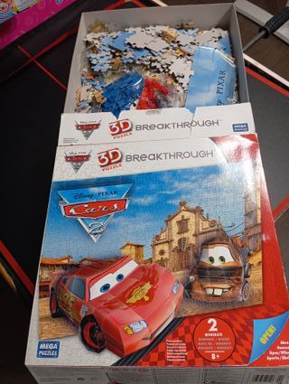 Puzzle 3D de Cars 2 de Mega Puzzles. ¡Construye tu propio coche de la película! - Personajes: Rayo McQueen y Mate. - Nivel de dificultad: 2 (Moderado). - Edad recomendada: 8+ años.