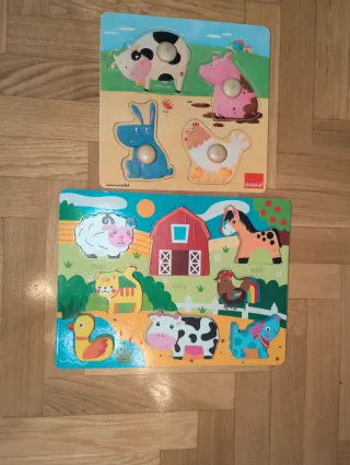 Dos puzzles de madera con temática de granja, ideales para los más pequeños. Cada puzzle tiene piezas grandes y coloridas. - Puzzle 1: Vaca, cerdo, conejo y gallina. - Puzzle 2: Oveja, caballo, gallo, pato, vaca, perro y gato. - Marca: Goula.