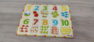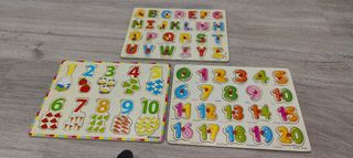 Conjunto de 3 puzzles independientes de madera. La base del puzzle mide 30x22 cm y 0,7 cm de altura. Cada pieza tiene 1,2 cm de grosor. - 1 Puzzle del abecedario. - 1 Puzzle de números del 1 al 10 y en cada ficha se puede contar por ejemplo en el 8 hay 8 peras. - 1 Puzzle del 1 al 20 y con la palabra de cada número en inglés.
