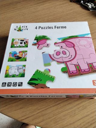 Puzzle infantil de madera de la marca Spielin. Perfecto para niños de 3 años. Incluye 4 puzzles con diferentes animales de granja. Los puzzles están en buen estado y son ideales para el aprendizaje y el entretenimiento.