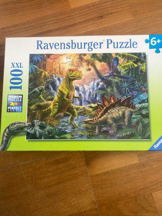 Puzzle infantil de 100 piezas con temática de dinosaurios y un paisaje prehistórico. - Ilustración colorida de dinosaurios. - Ideal para niños. - una pieza esta deteriorada