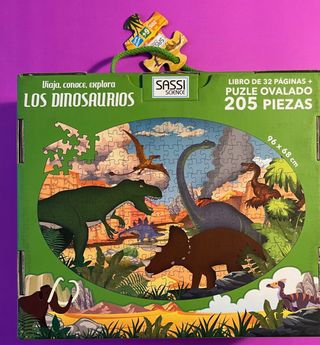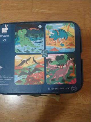 Caja compuesta por 4 puzzles de dinosaurios. Tiene todas las piezas y sus bolsas respectivas.