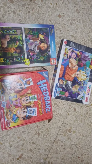 Lote de juegos de mesa y puzzles. - Juego de mesa Hedbanz de Bizak. Le falta el reloj de arena - Puzzle Supercolor de Clementoni de Dragon Ball Z (180 piezas). - Puzzle Educa de Disney Encanto (2 puzzles de 48 piezas cada uno).