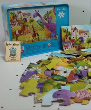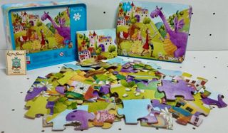 Puzzle infantil de 54 piezas con una divertida escena de dragón y castillo. - Incluye caja metálica para guardar las piezas. - Ilustración a todo color.