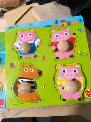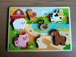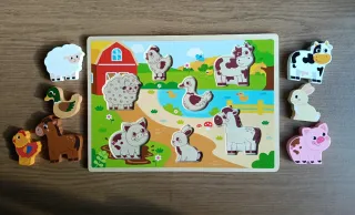 Puzzle de madera con temática de granja y animales. - Incluye piezas de madera con forma de animales y elementos de granja. - Diseño colorido y educativo. - Ideal para el desarrollo de la motricidad fina. + 1 año
