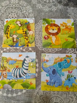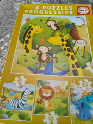 Set de 4 puzzles progresivos de la marca Educa con temática de animales. - Incluye 4 puzzles de diferentes tamaños y número de piezas. - Diseños con jirafas, monos, cebras, leones y elefantes. - Ideal para el desarrollo de la motricidad fina y la lógica.