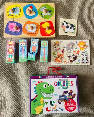 Conjunto de cinco puzzles y un libro para niños. - Puzzle de madera con animales de granja. - Puzzle de vaca de piezas. - Puzzles de bloques con personajes. - Puzzle de animales. - Caja de texturas con dinosaurio y puzzles de silicona.