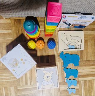 Conjunto de juegos educativos para el desarrollo infantil. - Torre de bloques apilables con números. - Puzzle de madera de elefantes. - Juego de encajables de formas con Winnie the Pooh. - Pelota sensorial. - Juego de anillas apilables.