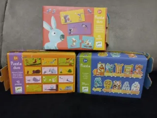Lote 3 Puzzle Duo de la marca Djeco. Cada puzzle está compuesto por dos piezas. Para edades de 2 y 3 años. - Mamá & Bebé. 12 piezas - Contrarios. 12 piezas - Tren animales. 20 piezas