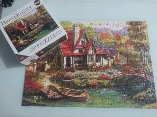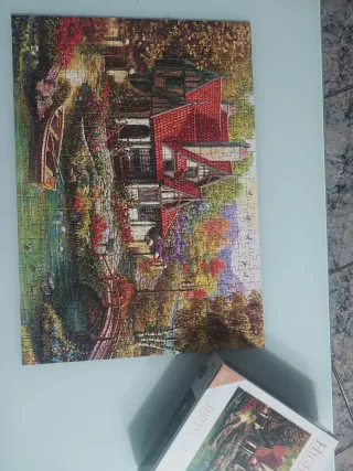 Puzzle de 500 piezas con una escena de casa y jardín en otoño. La imagen muestra una casa con tejado rojo, un puente y un estanque con patos. - 500 piezas. - Imagen detallada de paisaje otoñal. -Esta nuevo