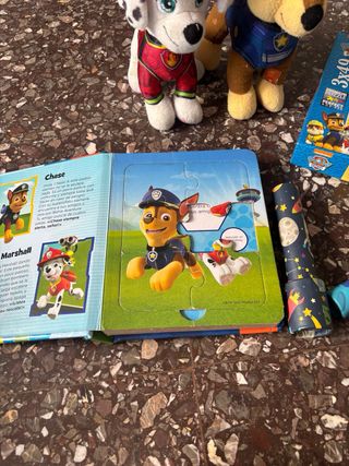 Pack de la Patrulla Canina con un puzzle, dos peluches y un libro de puzzles (le faltan dos piezas), de regalo dos caleidoscopios. - Libro Puzzle de la Patrulla Canina. -Incluye peluches Ravel y Marshall - Puzzle Ravensburger de 3x49 piezas. - Incluye dos kaleidoscopios con temática espacial.