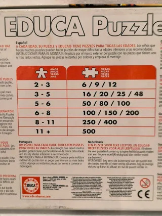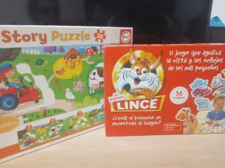 Dos juegos de mesa infantiles de la marca Educa. - Puzzle Story Puzzle con 26 piezas y temática de granja. - Juego Mi Primer Lince para agudizar la vista y los reflejos, con 36 imágenes. El del unicornio de regalo que tiene dos rotos en la caja.