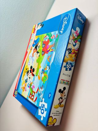 Puzzle de Mickey Mouse y amigos de Disney, con 50 piezas. - Personajes: Mickey, Minnie, Goofy, Donald y Daisy. - Escenario: Playa con coche rojo y faro. - Ideal para niños y fans de Mickey Mouse Club House.